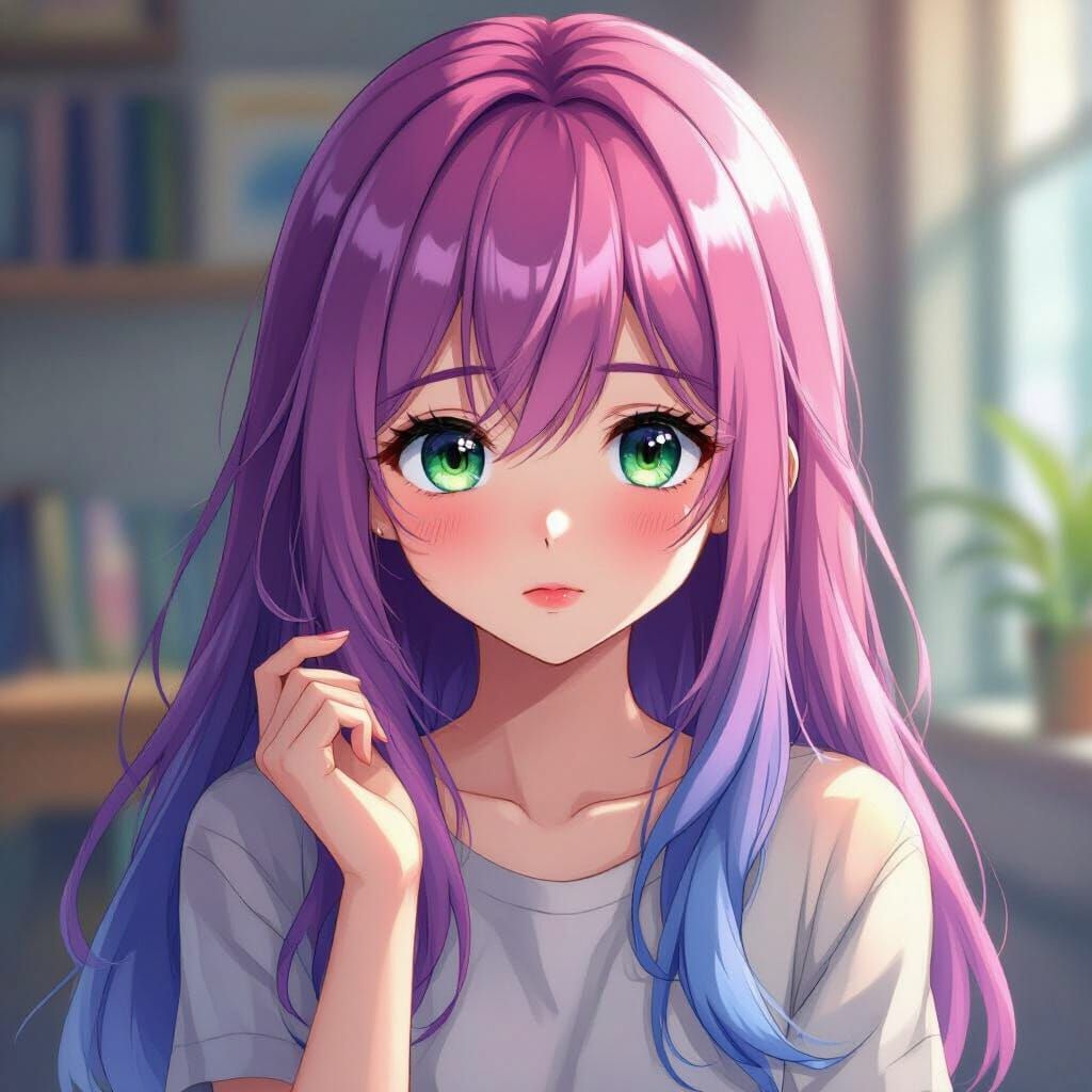This anime-style image features a young girl with long, flowing pink, purple, and blue gradient hair and large green eyes. Her reserved posture and flushed cheeks suggest a shy demeanor, rendered with cel-shading and vibrant colors.