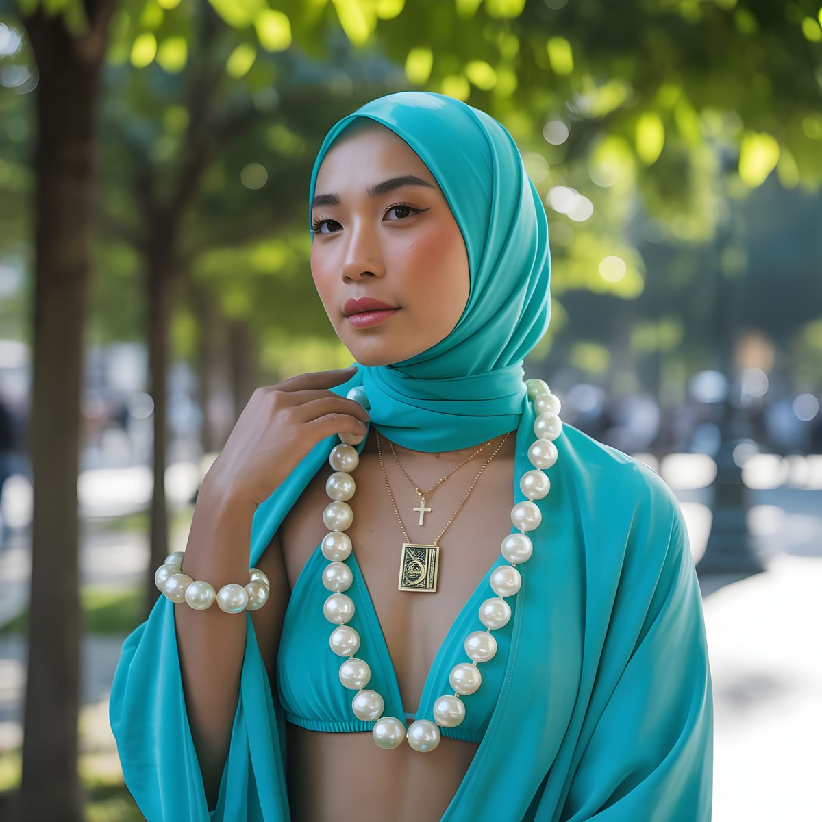 This image shows an Asian woman in a turquoise hijab and pearl bikini, posed in a sunny park. She wears a pearl body chain and a necklace with religious pendants, contrasting secular and sacred elements.