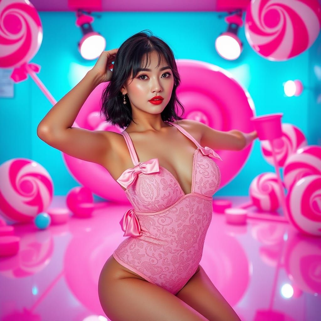 A striking picture of a Japanese woman in a pink lace outfit, posing in a pop art setting with bubblegum props. The scene is awash in pink and blue hues and rendered as high fashion photography.