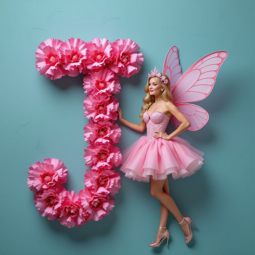 This image shows a delicate pink fairy positioned next to the letter 'J', which is intricately crafted from vibrant pink carnation flowers.