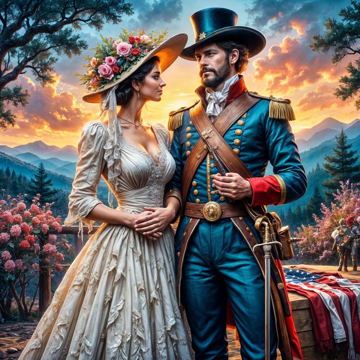 A Civil War Union Soldier, holding a sword, stands next to his bride who is wearing her old fashioned bridal gown and wide brimmed bridal hat. On a table next to the soldier is a draped flag of the United States of America. In the background are the Blue Ridge Mountains, in shades of blue with a sunset ...