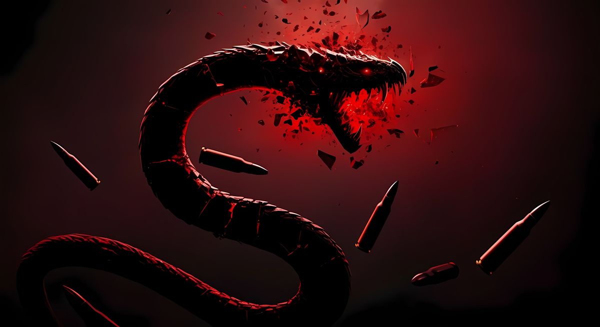 This image depicts a surreal scene of bullets shattering against a massive, serpentine silhouette, rendered in bold red tones and abstract shapes.