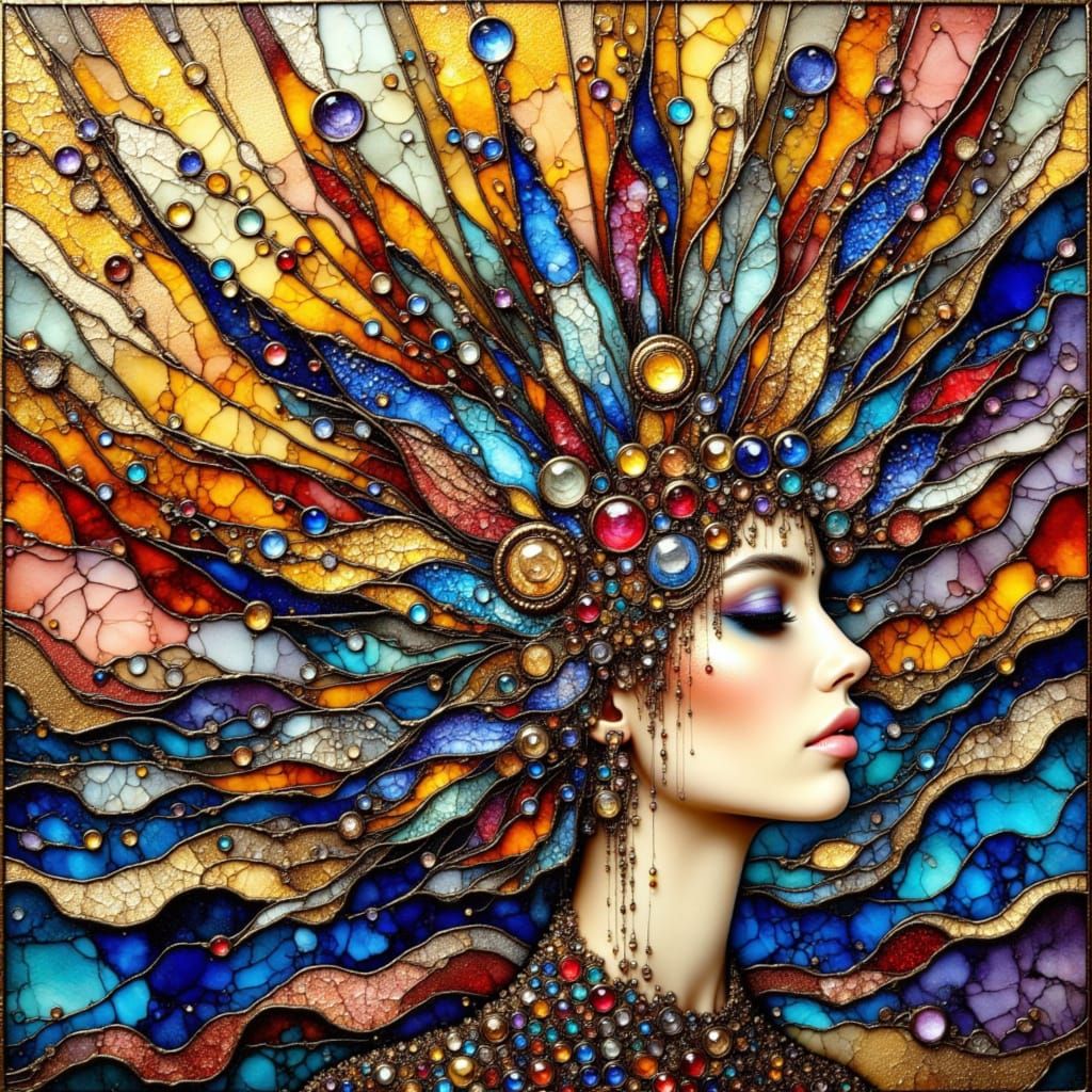 This image shows a surreal portrait with a head exploding in chaos. It features geometric waves, vivid colors, and an asymmetrical art nouveau background with a stained glass effect, rendered in alcohol ink.