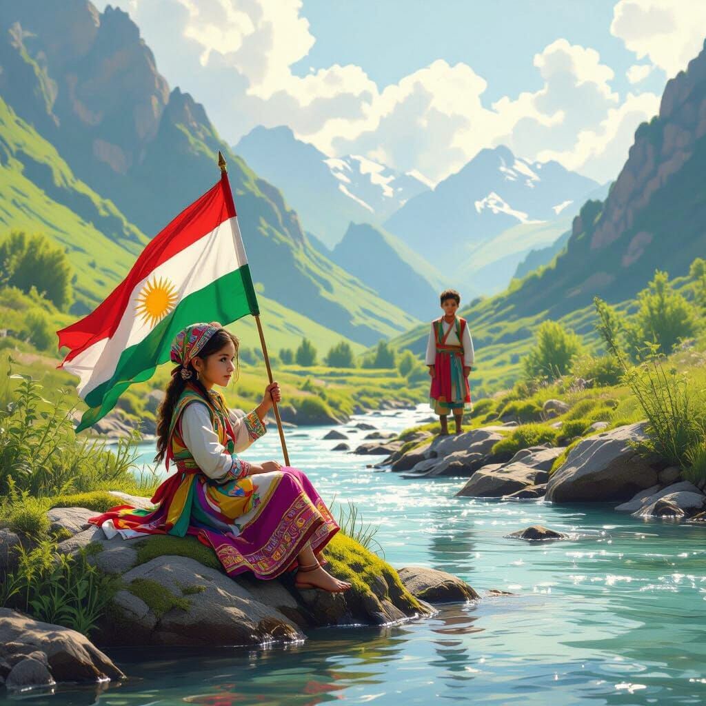 This image shows a girl and boy in traditional Kurdish dress by a river, holding a flag with a golden sun. Lush mountains are in the background, depicted in a vibrant, illustrative style with rich colors.