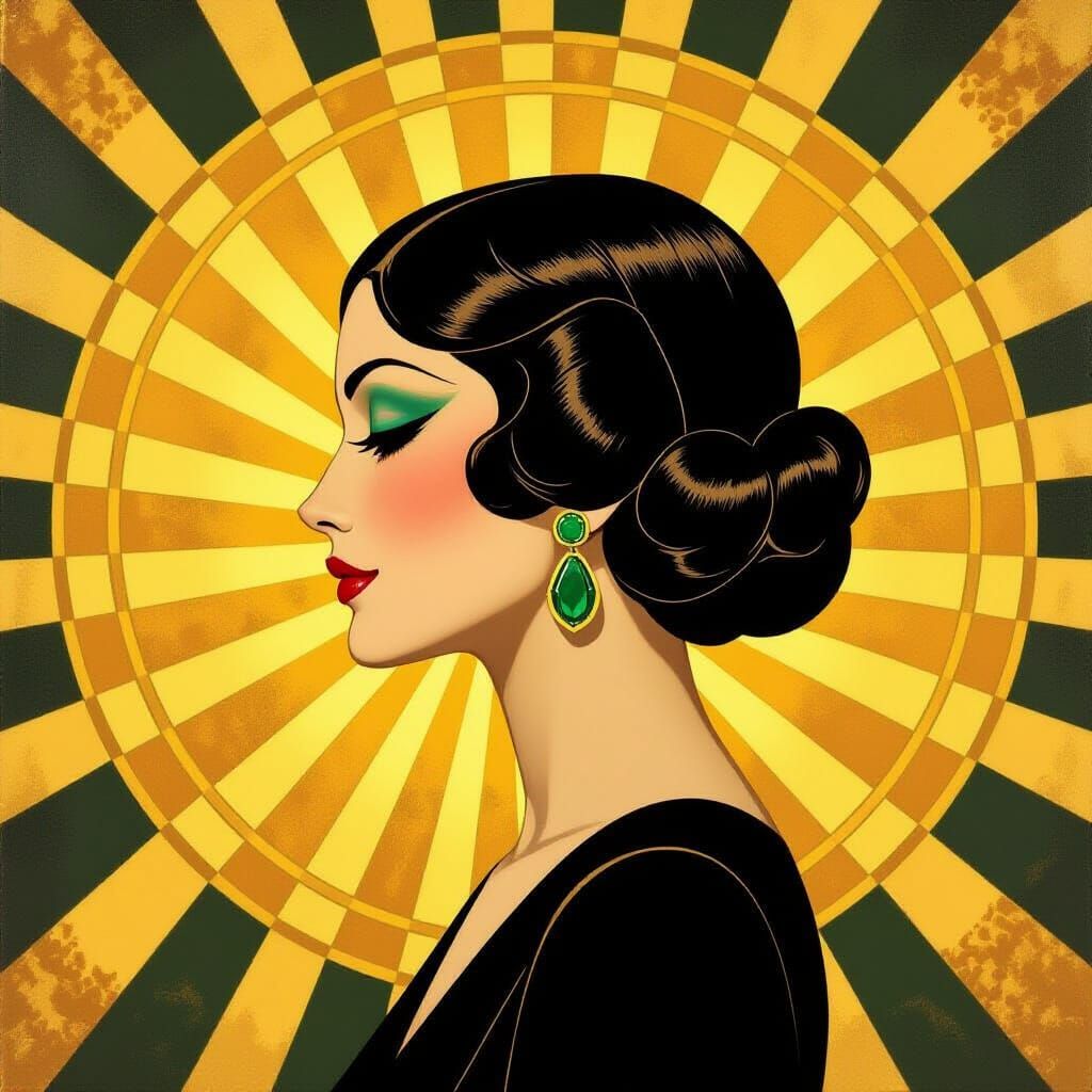 A stylized Art Deco portrait of a woman in profile, adorned with emeralds and framed by golden geometric elements. Inspired by bold forms and rich colors, with a painterly texture and warm cinematic light.