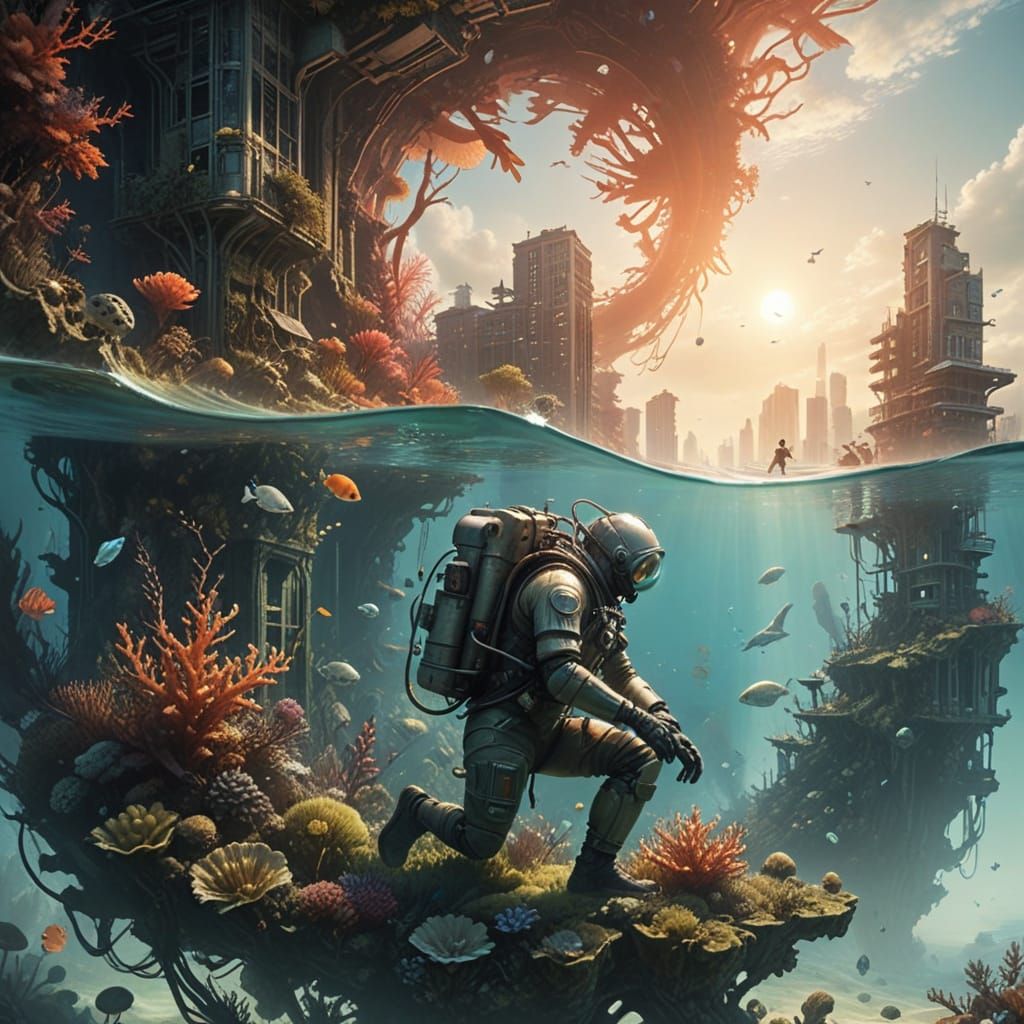 This haunting image shows a lone diver in a vintage suit drifting past the skeletal remains of skyscrapers, now home to coral and seaweed, in a surreal underwater scene blending digital art and magical realism.