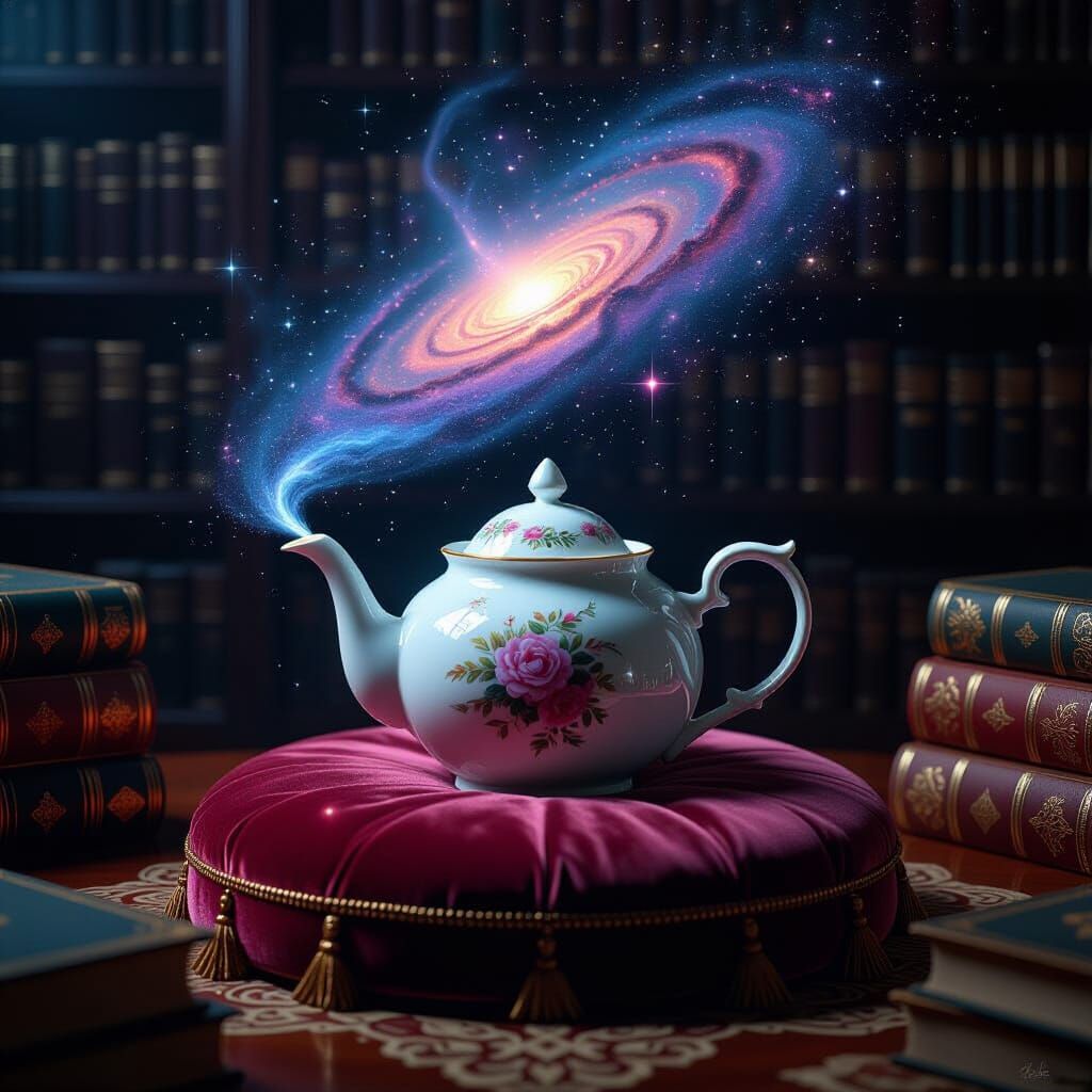A photorealistic image of an antique teapot on velvet, releasing swirling nebulae and stars from its spout. Cinematic lighting creates a magical, detailed scene.