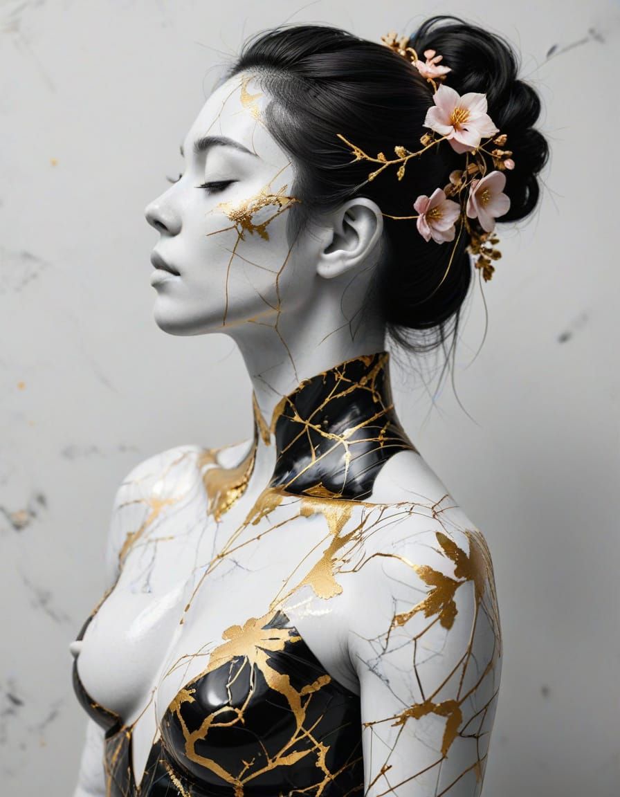 This image features a realistic black and white profile of a woman with golden kintsugi joints. The art style emphasizes marble-like textures and highlights the intricate golden repairs against a monochromatic background.