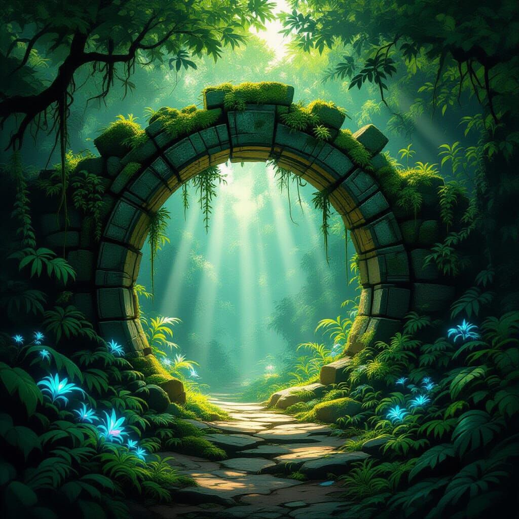 This image depicts a mysterious, mossy stone archway in a dense, forgotten jungle. Ethereal god rays illuminate an overgrown path, with strange, bioluminescent plants glowing softly. The style is atmospheric fantasy concept art with impressionistic digital painting.