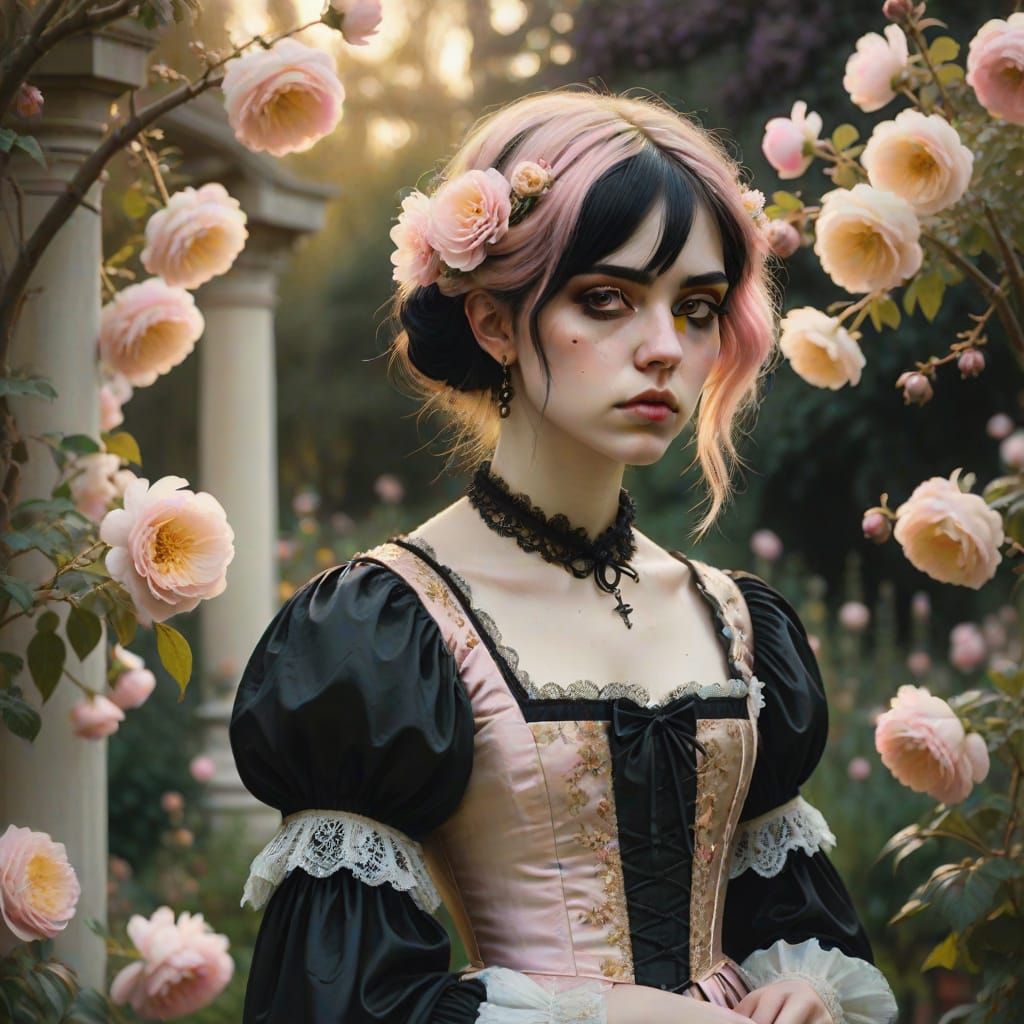A striking picture of an emo goth girl in a garden. The portrait is reminiscent of an oil painting, with soft, golden light and a warm, muted color palette. Pastel pink petals surround her.