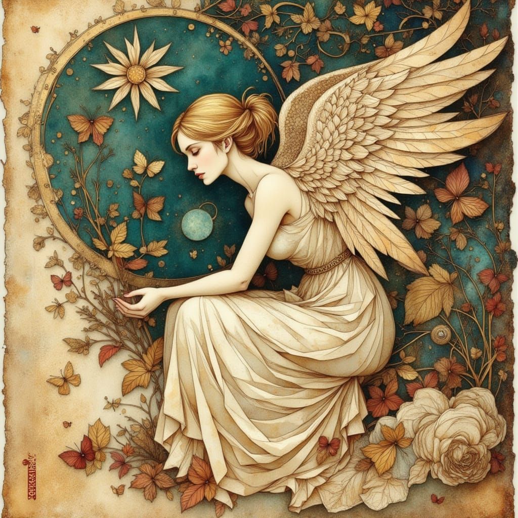 This image depicts a kirigami Angel of Death at the foot of a bed. The artwork is presented in a paper toll and paper cut style, with earth and teal tones.