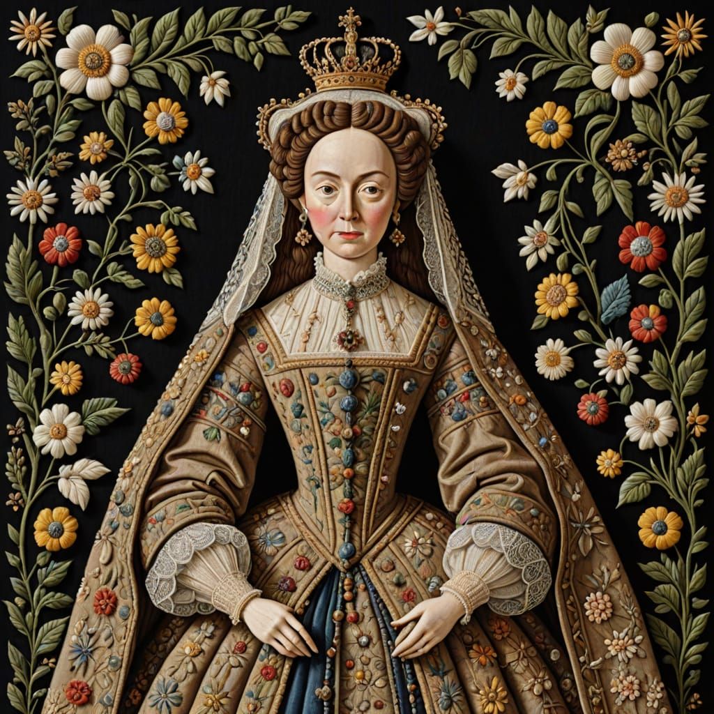 This image depicts a heavily embroidered stumpwork picture of a queen. The artwork evokes the style and techniques of 17th-century embroidery.