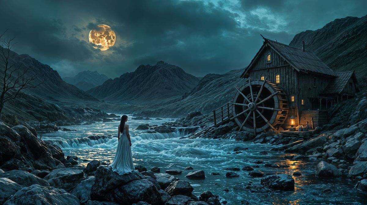 This image captures a serene yet turbulent night landscape, with a slender girl standing by a stormy river amidst a rickety old watermill, set against a dark, moonlit sky with silhouetted mountains in the background, rendered in hyperrealistic detail with a focus on textures and cool, muted colors.