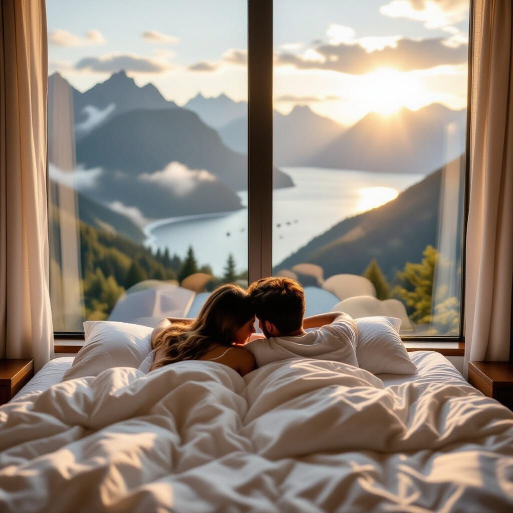 This image shows a couple in a hotel room, enjoying a peaceful morning with a view of mountains, clouds, forests, and ocean waves. Rendered in a Romantic Realism style with soft lighting.