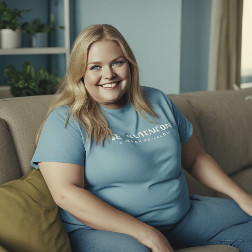 A serene portrait of a plus-sized woman with long blonde hair and gentle blue eyes, set in a warm and inviting living room, captured in a cinematic film still with film grain and vignette effects.