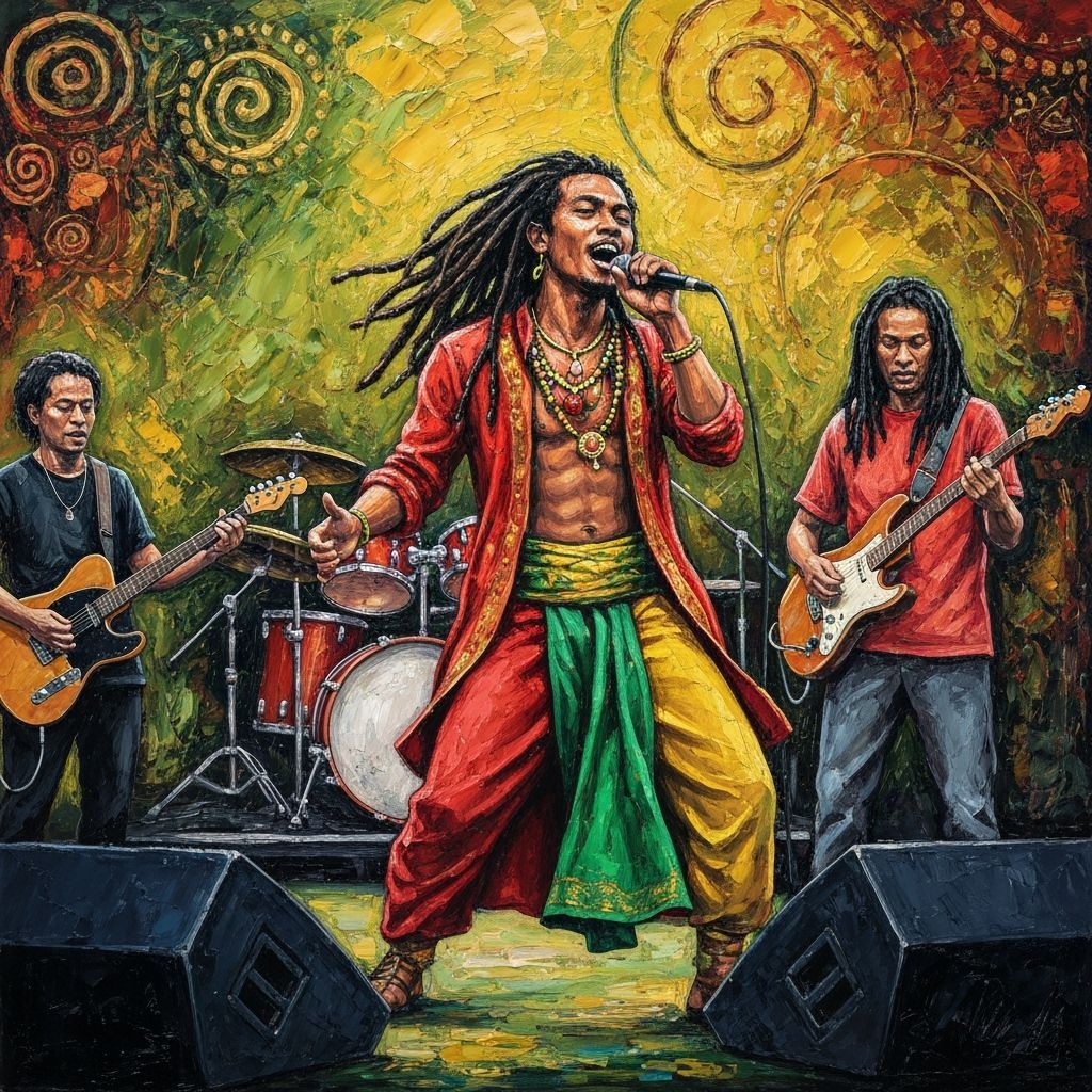 This image shows a reggae performance in Chongqing, with a vibrant Indonesian singer in red, gold and green. The artwork features swirling patterns, bold brushstrokes and thick textured layers with an expressionist aesthetic.