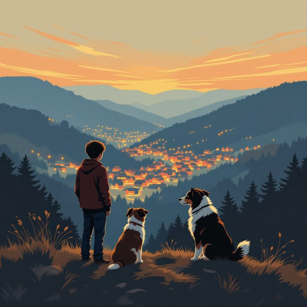 This image captures a poignant moment of a teenage boy and his dog on a ridge, looking down at a small, illuminated town. It evokes a sense of coming-of-age with atmospheric lighting and rich, earthy tones.