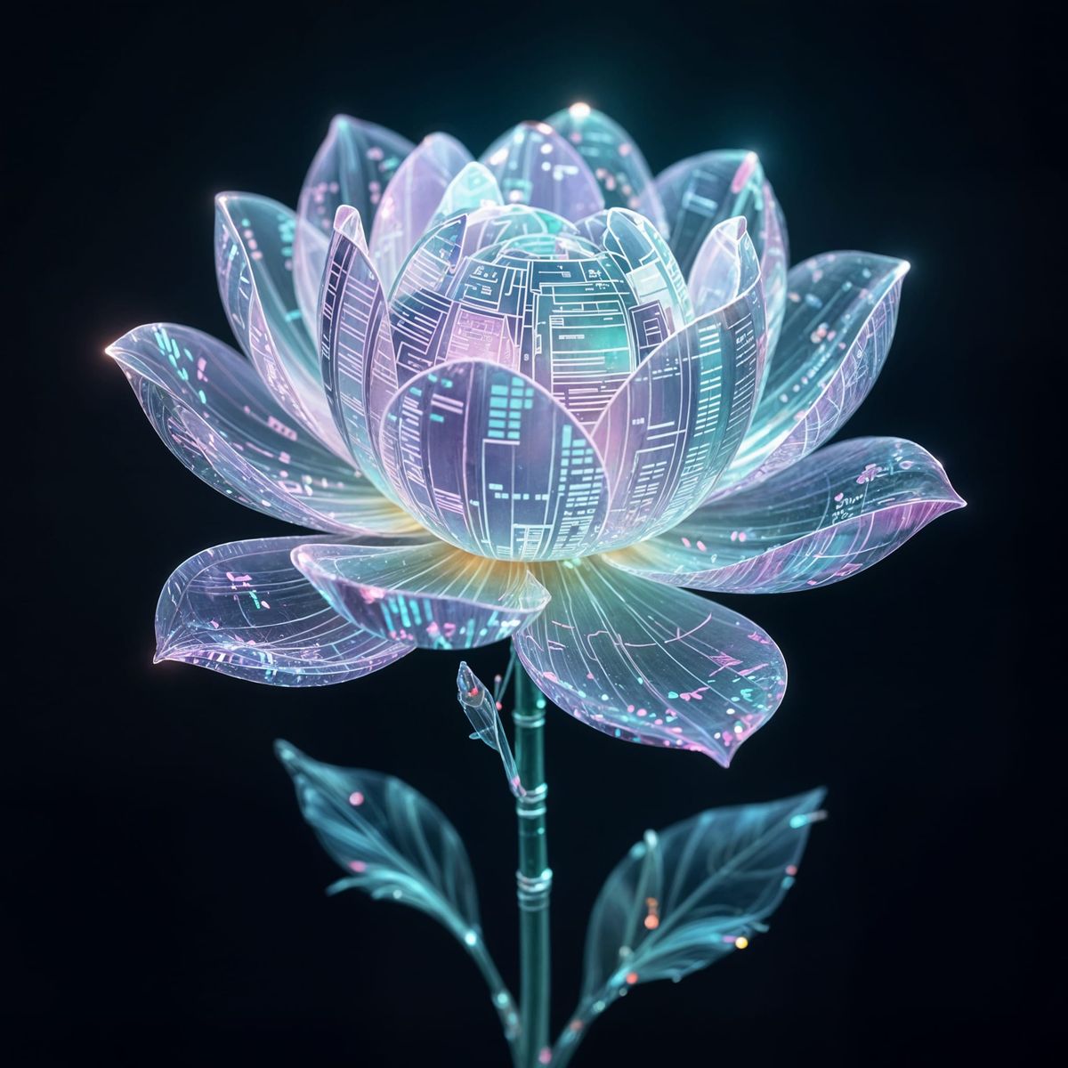 This image shows a serene, ethereal flower in lavender and seafoam green. Upon closer inspection, its petals are holographic displays showing data, with a stem of fiber optics.