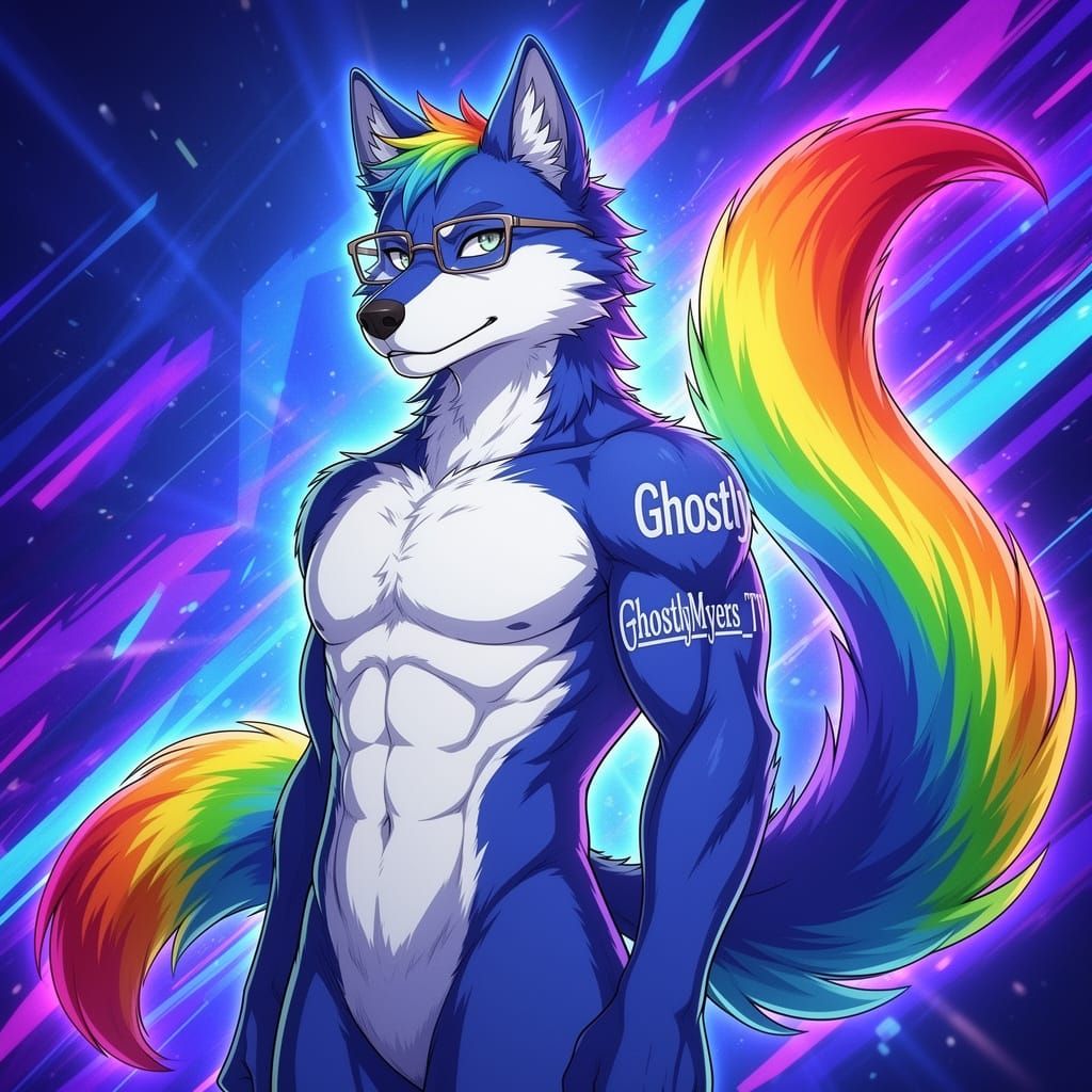 This AI-generated image features a tall, anthropomorphic wolf fursona with striking rainbow and blue fur, two tails, and unique arm tattoos. Rendered in a vibrant anime style with dynamic lighting.