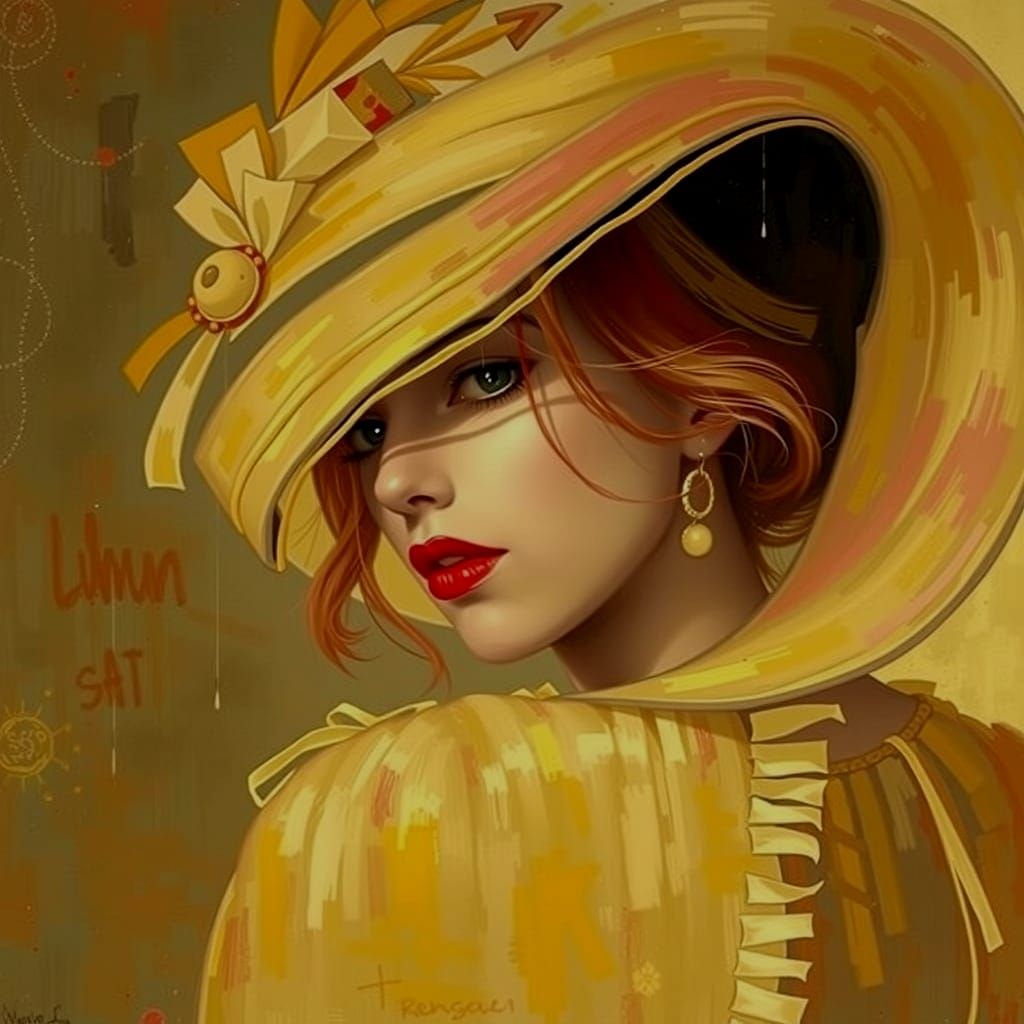 This striking black and white portrait features a woman wearing an artistic hat, her face veiled in shadow with a single vivid crimson streak.