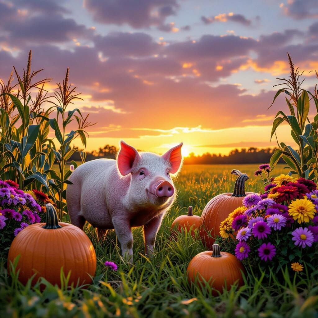 This image shows a pig in a vibrant autumn scene. Pumpkins, corn stalks, purple and gold mums, and asters surround the pig, with a golden sunset in the background. The image is in a realistic style.