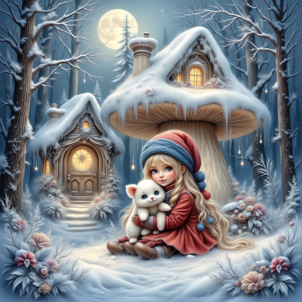 This photorealistic illustration shows a girl in a red coat holding a fluffy creature near a glowing mushroom house in a magical, moonlit winter forest. Detailed, cinematic lighting.