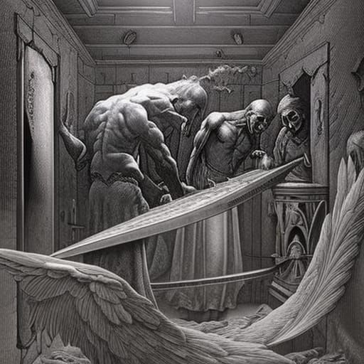 This image shows a chilling depiction of the Angel of Death within a medieval morgue setting. The scene includes surgery tools and an operating table, rendered in a horror art style.