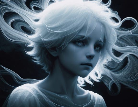 This image shows a spectral child with white hair and a glowing aura, rendered in an expressive scratch art style. Ethereal tendrils of light and deep shadows create a haunting, monochrome atmosphere.