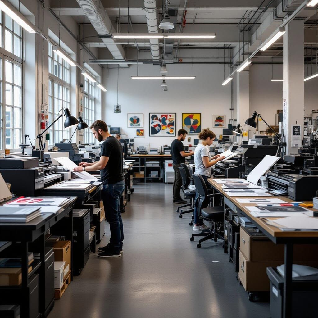 This image showcases a modern typographic print shop with commercial equipment and a busy production floor. The design incorporates industrial and minimalist aesthetics inspired by Swiss Style.