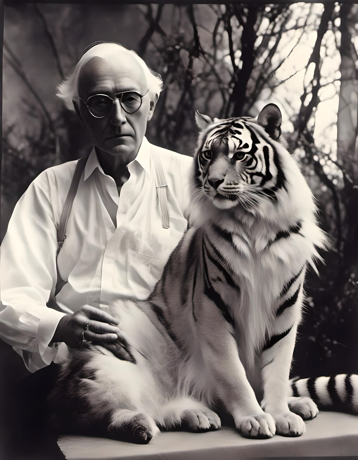This image depicts a grandfather and his cat, Tiger. The image has a smooth, photorealistic style, resembling a vintage photograph.