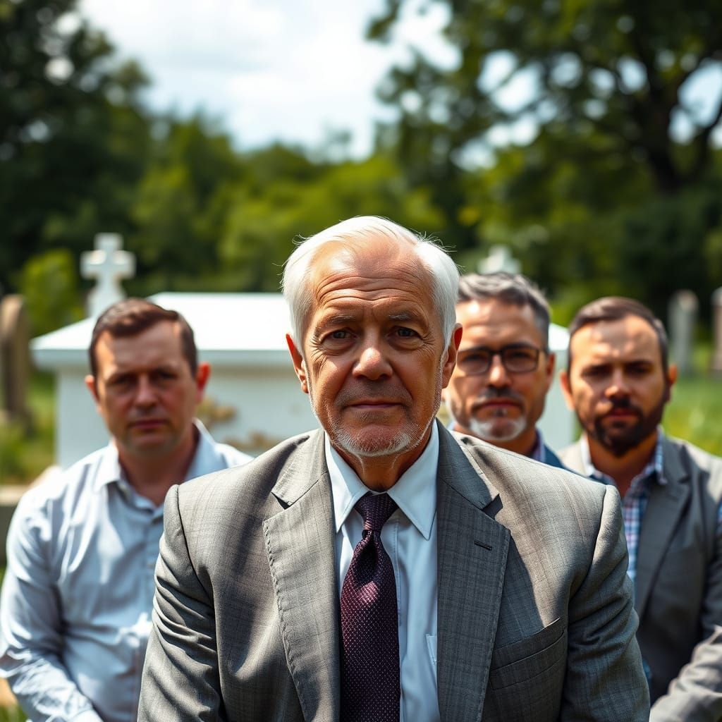 A poignant family portrait of a dignified patriarch and his sons, set against the serene backdrop of a rural cemetery on a warm summer morning, with a sense of respect and solemnity