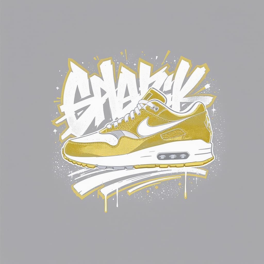 This flat design logo features a dynamic sneaker silhouette with graffiti-inspired lettering. Presented in a modern, urban vector illustration style with gold and white colors.