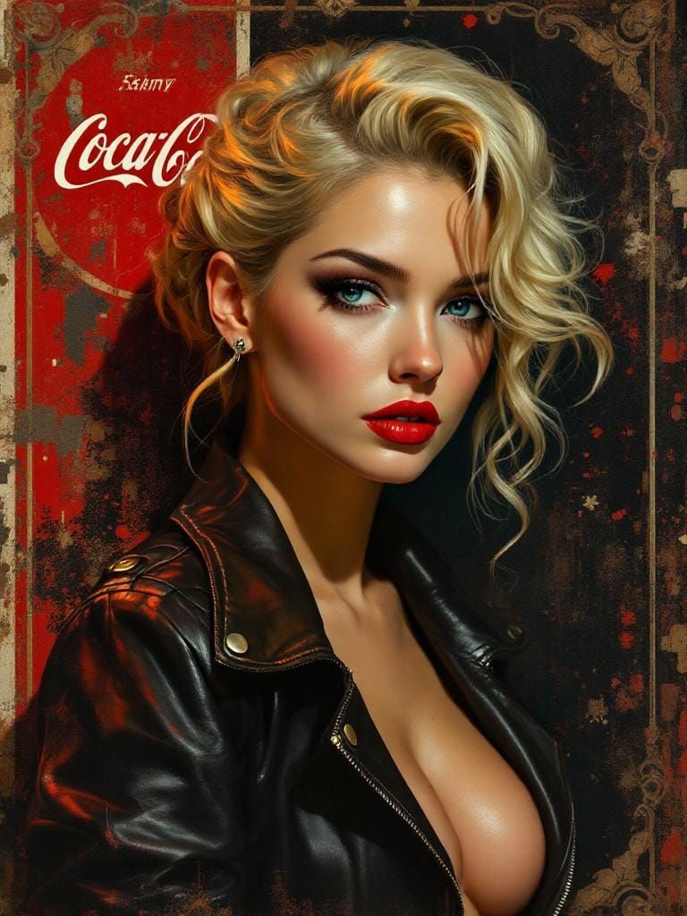 A fusion of classic baroque painting meets vintage commercial art. This image captures a slender woman in a leather jacket, rendered with dramatic lighting and a retro, pin-up aesthetic. The color palette evokes vintage Coca-Cola ads.