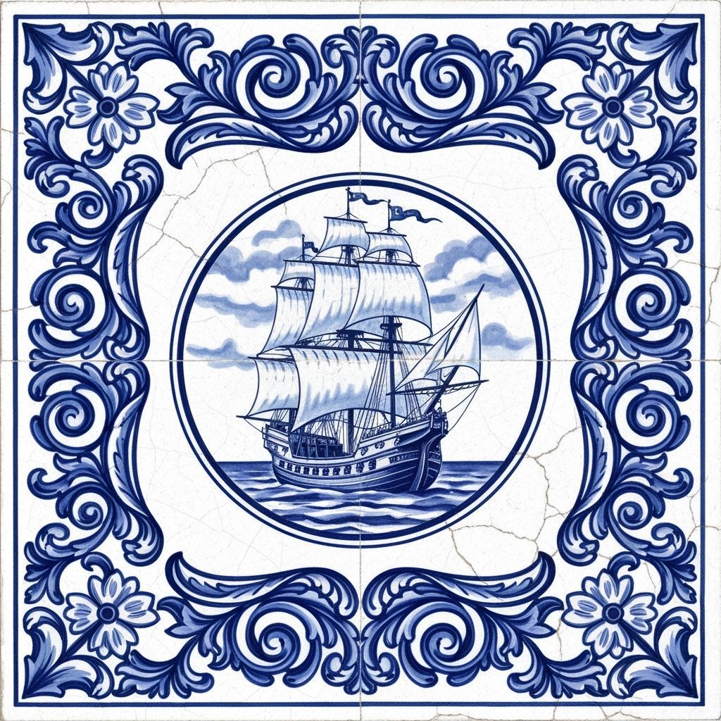 This image showcases a Spanish Armada galleon on a Delft blue marble tile, framed by classic floral patterns. Evokes vintage porcelain with subtle aged cracks and iconic blue hues.