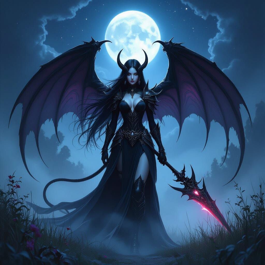 A striking image of a pale daemon knight girl with black hair, wings, and tail, wielding a glaive in a misty glade under a cosmic moon. Rendered in a dark fantasy style with dramatic lighting.