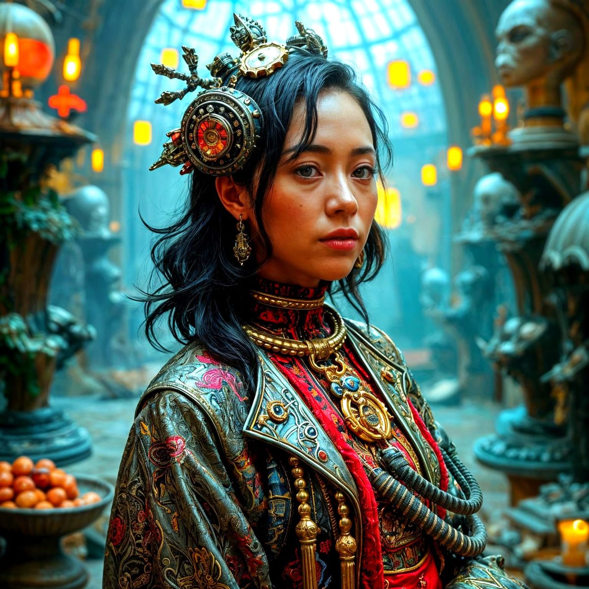 A composite art image with a fantasy atmosphere. The composition features horror and colorful elements with fluid lines, creating a sharp focus as a digital illustration.