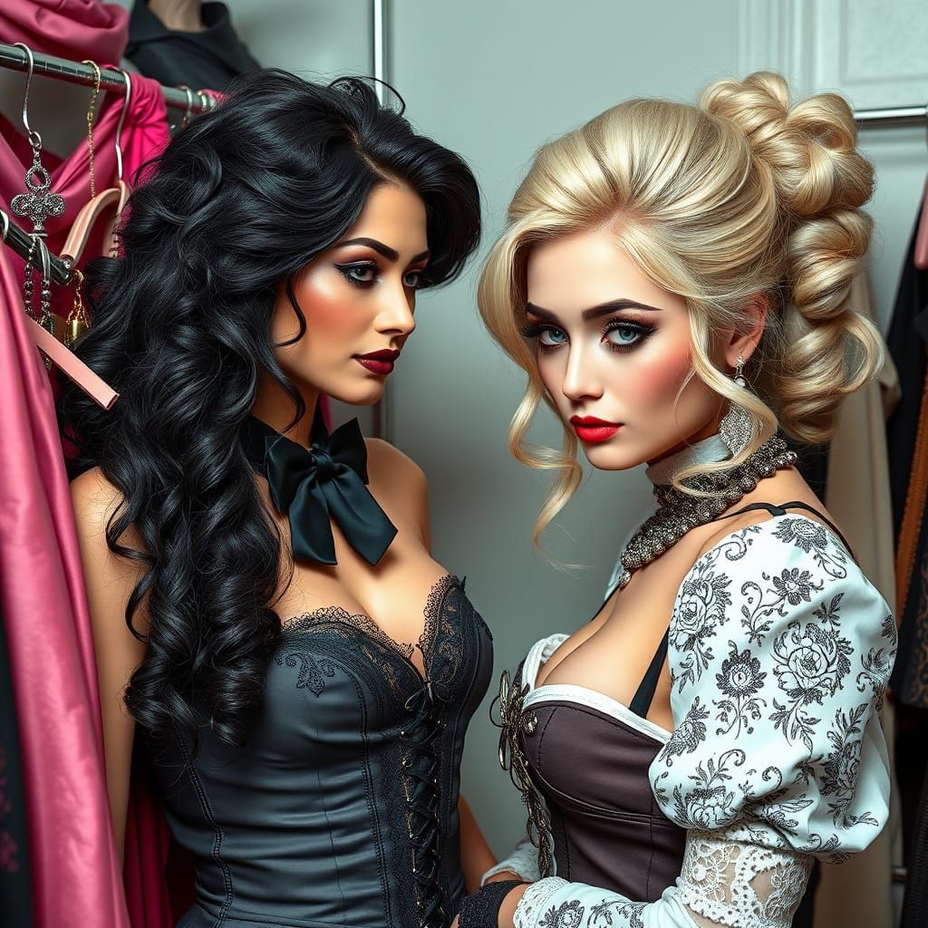 This image shows a crossdresser being assisted by a friend in selecting accessories for a fashion show. The scene is highly detailed, focusing on feminine objects and fashion elements.