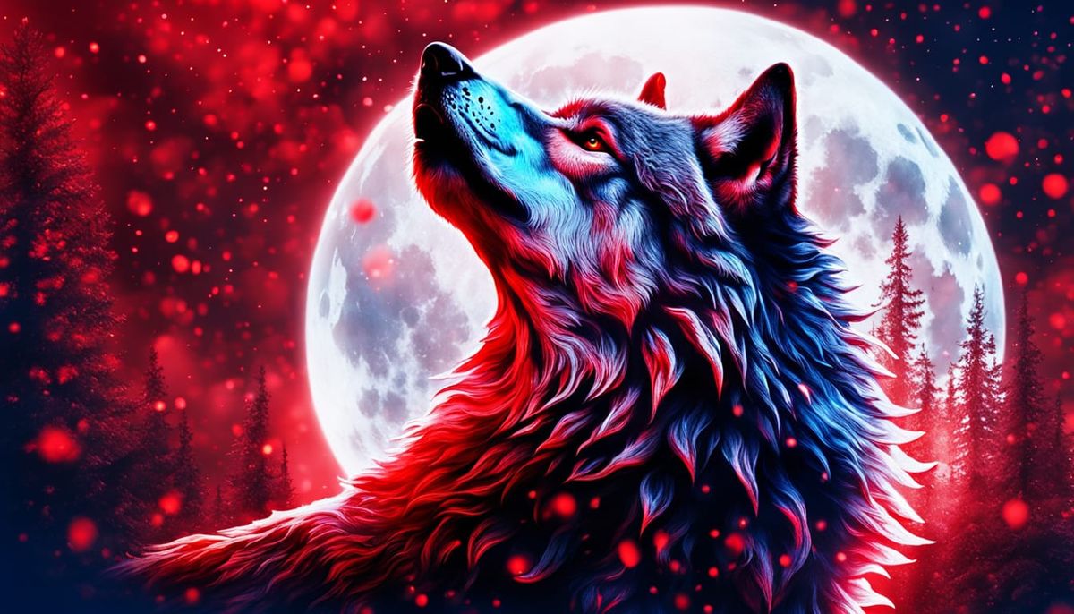 This image shows a wolf howling at the moon during a red snowstorm. The macro photograph features abstract photorealism and hyperdetailed textures with glowing edges, rendered as a hologram simulation.