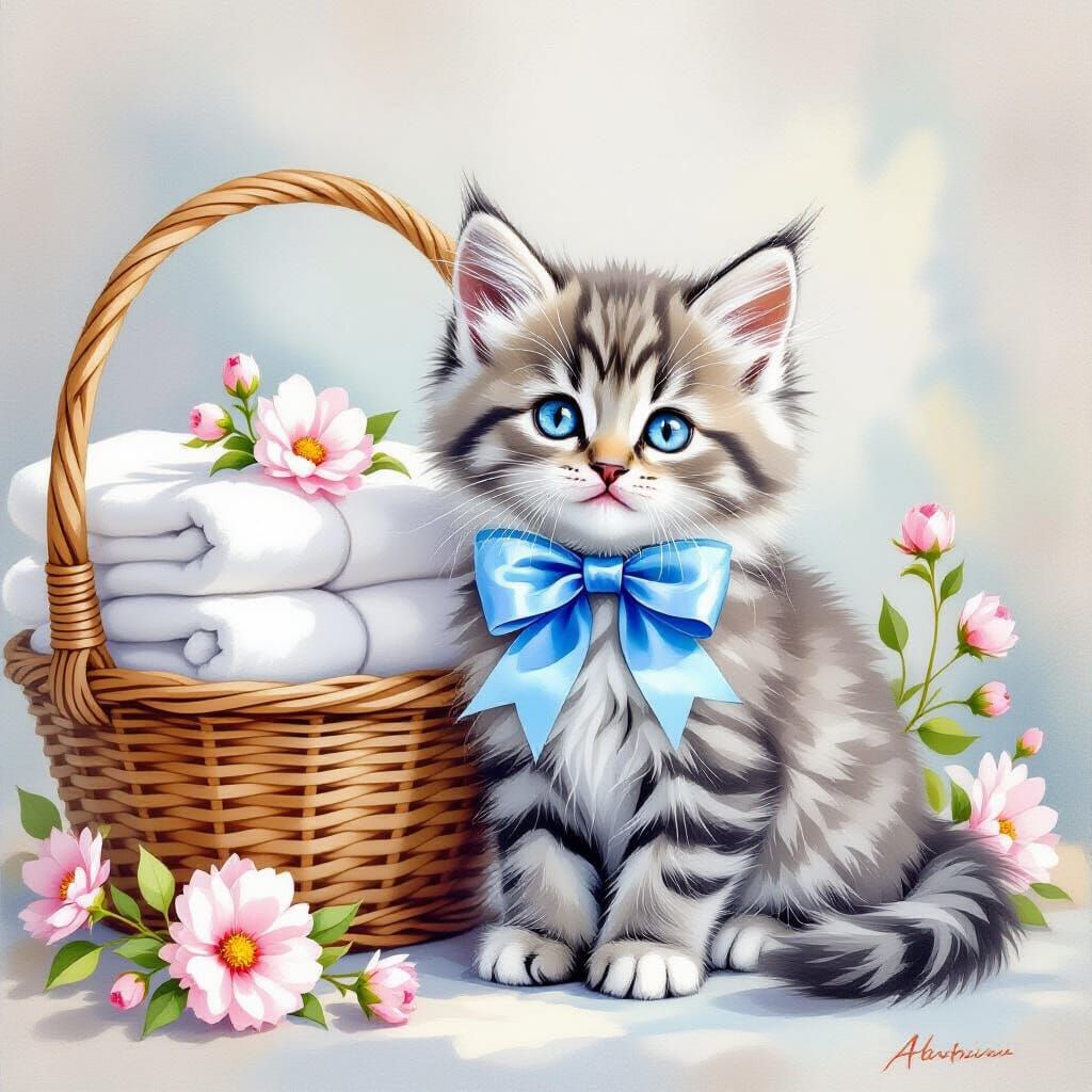 This image shows a cute, fluffy gray kitten with blue eyes and a blue bow, sitting near a wicker basket with flowers. Painted in a loose watercolor style with soft lighting.