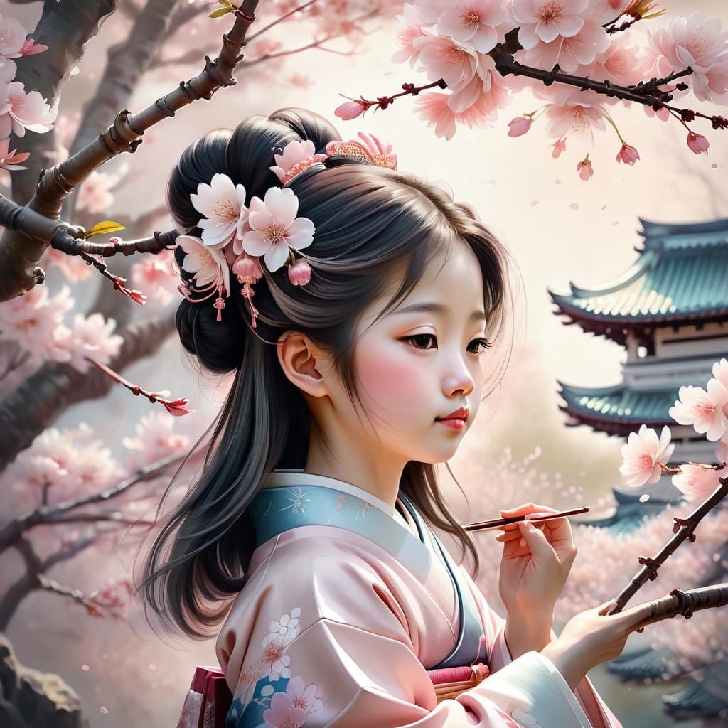 A delicate watercolor of a young girl in traditional Japanese geisha attire, seated among cherry blossoms. The artwork is rendered in soft, pastel hues with gentle lighting and exquisite detail, reminiscent of traditional Japanese art.