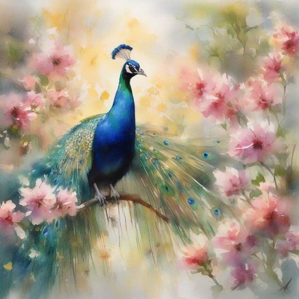 A watercolor painting capturing a peacock fanning its tail among spring blossoms. Features radiant jewel tones and painterly realism with expressive brushstrokes.