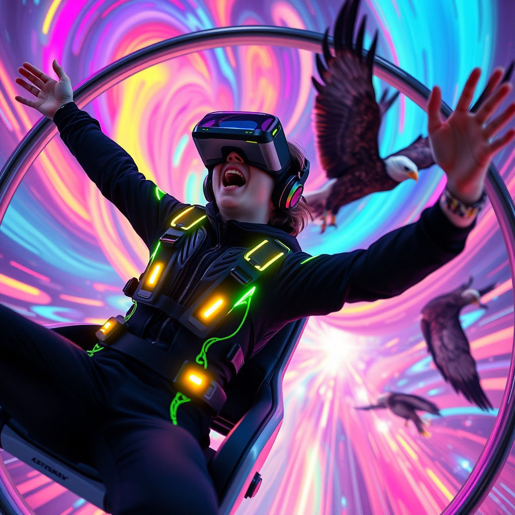 A vibrant image shows a teenager in a haptic suit and VR headset, immersed in a simulated flight experience. The futuristic cyberpunk aesthetic features neon colors and surreal patterns.