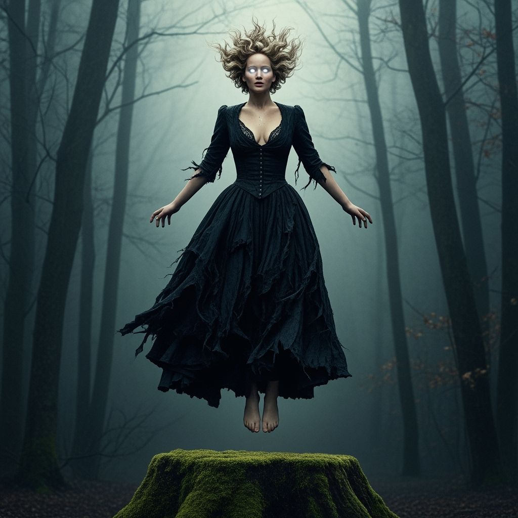 This image shows a ghostly figure floating above a tree stump. The figure has glowing white eyes, a tattered black dress, and wind-blown hair, set in a dark, gothic style.