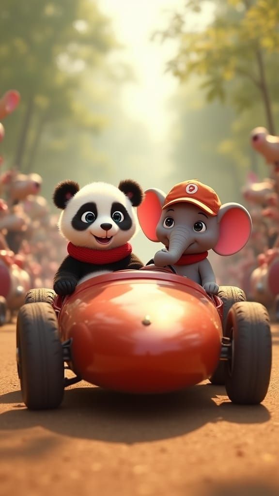This image shows a whimsical racing scene with a baby panda and elephant in vibrant cartoon cars, surrounded by cheering animals under bright morning light, in a style reminiscent of Pixar's 3D animation and cinematic film stills with a touch of film grain and color grading.
