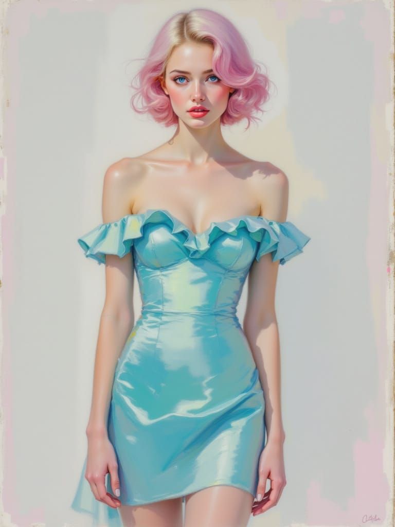 A full body shot of a 2024 pin-up woman with pink-tipped blond hair, wearing a short, metallic cyan satin dress, presented in a soft pastel art style.