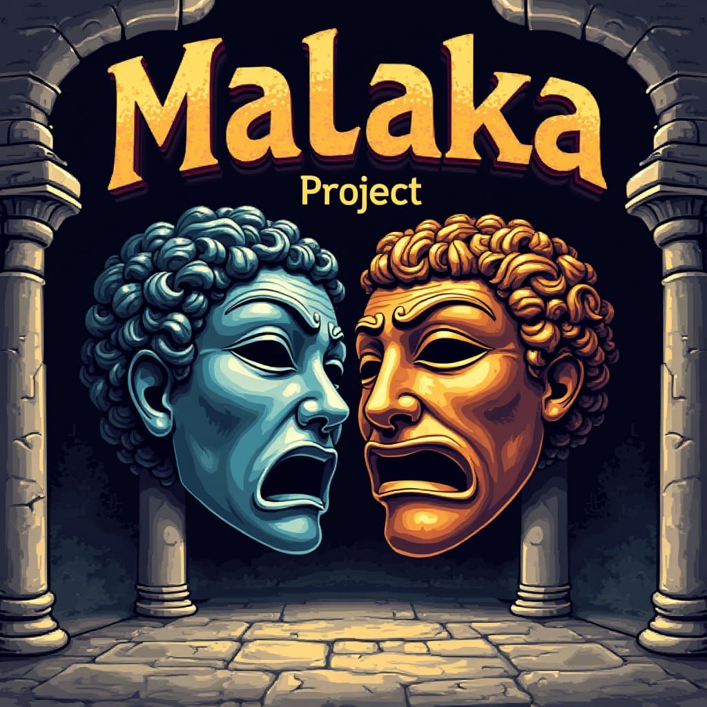 A vintage Commodore Amiga logo in pixel art featuring tragedy and comedy masks. The design has heavy outlines, flat colors, and dithering, reminiscent of 1990s Amiga game art.