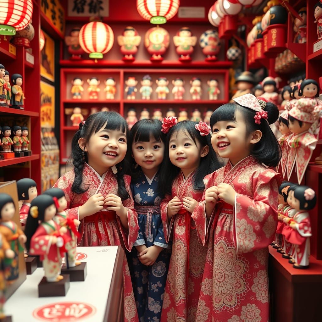 This vibrant image shows giggling girls in traditional Japanese clothing admiring intricately crafted Karakuri Dolls in a colorful shop, blending playful patterns and whimsical storytelling.