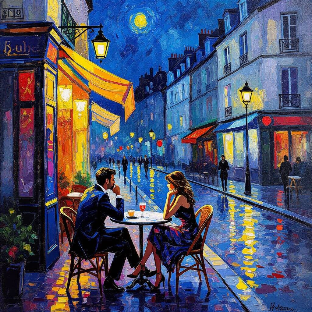 Generate your own unique images of Parisian cafes, coffee, and city nights easily and for free.