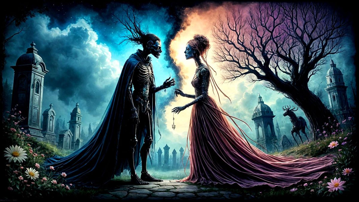 <lora:CICADA SONG:1.0> <lora:JapaneseInkBrush:1.0> <lora:Ink Poet:1.0> Split image: The left side features a dramatic steampunk-themed skeleton bride in a gothic, moonlit graveyard, with swirling fog and ancient tombstones. The right side shows the same skeleton bride in a brightly lit, whimsical fantasy ...