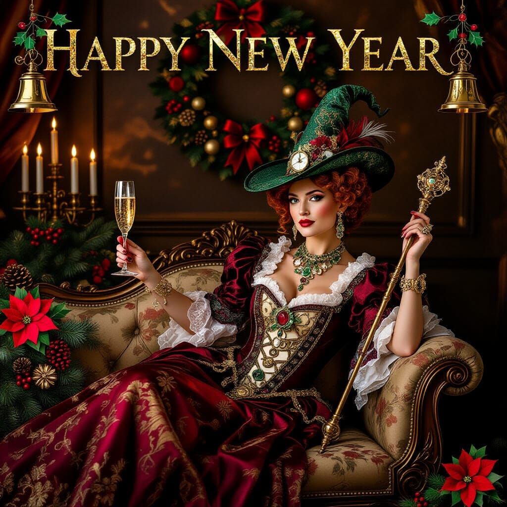 This image shows a Victorian steampunk empress in elaborate attire, celebrating New Year with champagne. Rendered in a classical oil painting style with dramatic lighting, it features festive elements.